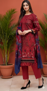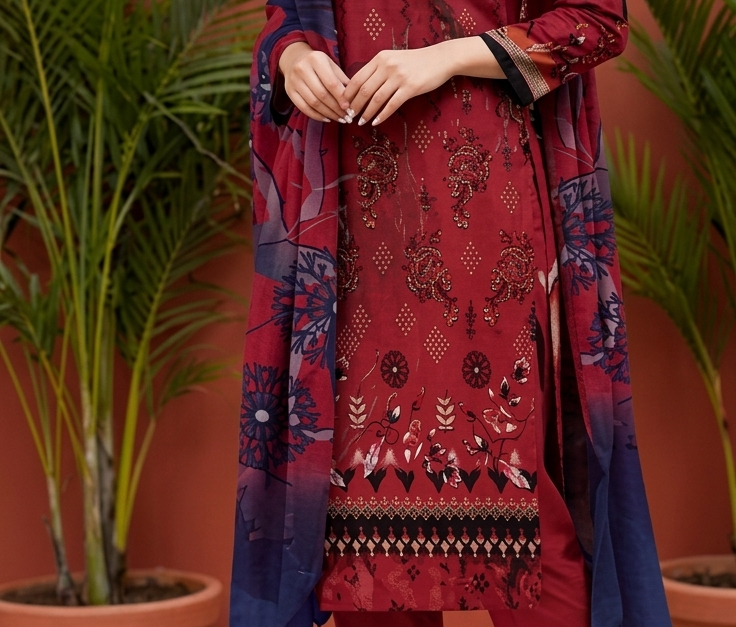 Upgrade your summer wardrobe with this elegant Orange Premium Lawn Digital Print 3-piece suit. Designed with a rich maroon/red base and intricate digital prints, this outfit offers a perfect blend of modern style and traditional charm.
